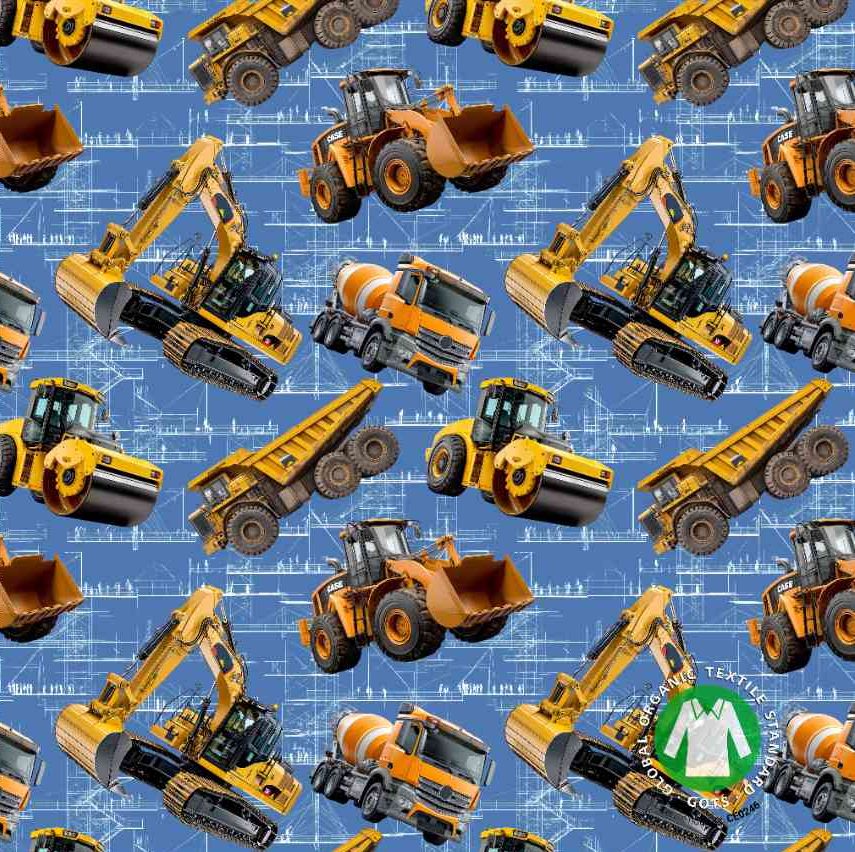 Trikotaaž erinevad kollased masinad sinisel GOTS digital print